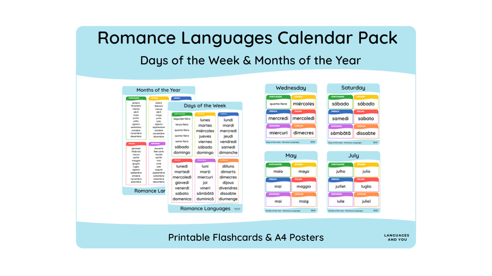 Romance Languages Calendar Pack is a clean, printable set of flashcards and A4 reference posters covering Days of the Week and Months of the Year across six Romance languages — plus English.